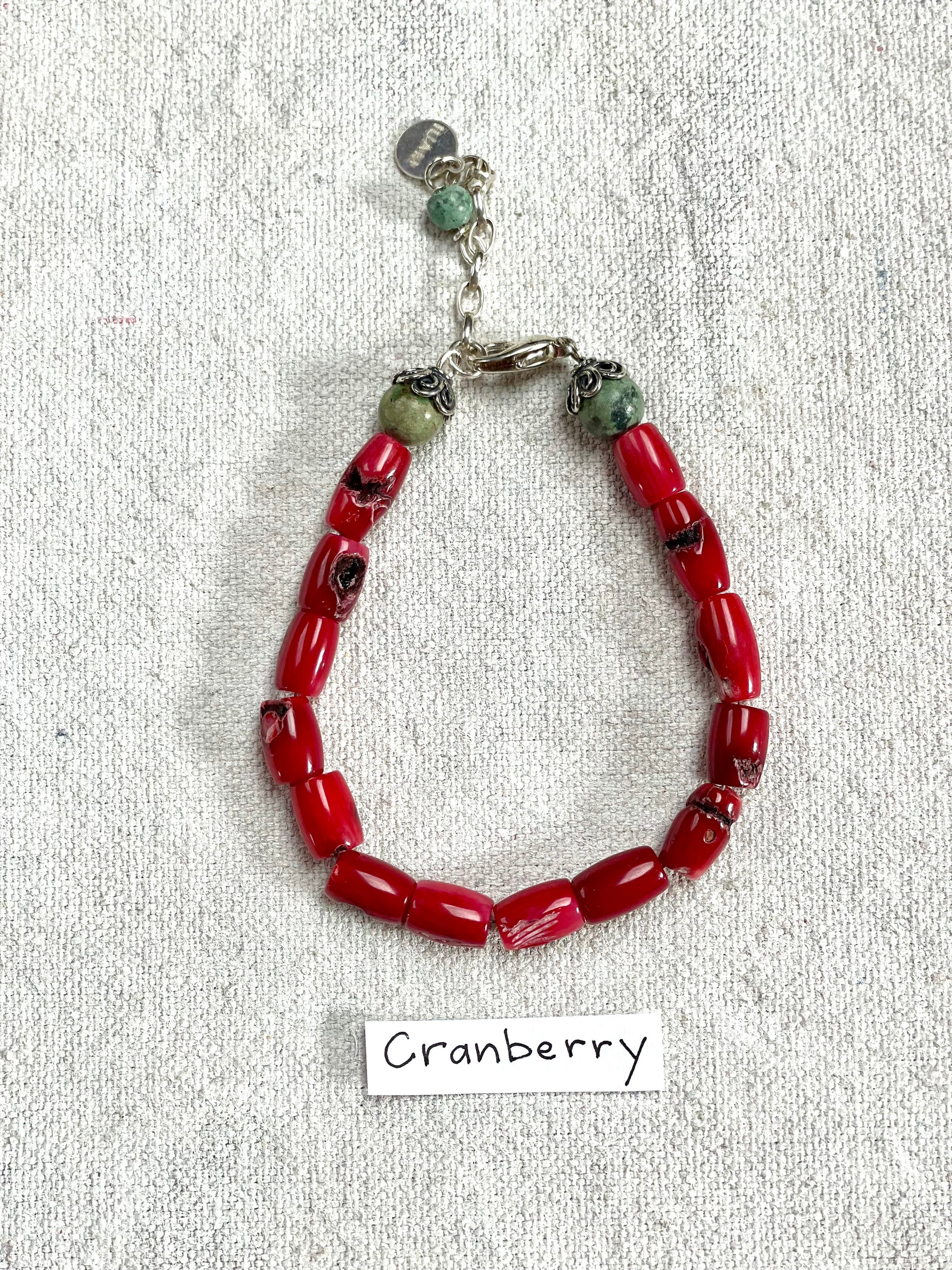 Add a pop of island-inspired color to your wrist with the Cranberry Bracelet. Crafted on Maui by Beth Ciaburri, the adjustable bracelet features red and green semi-precious stones. Complete with vintage-inspired silver embellishments and a charm engraved with "Maui", the adjustable bracelet is perfect for day or night wear. Prices include US shipping.