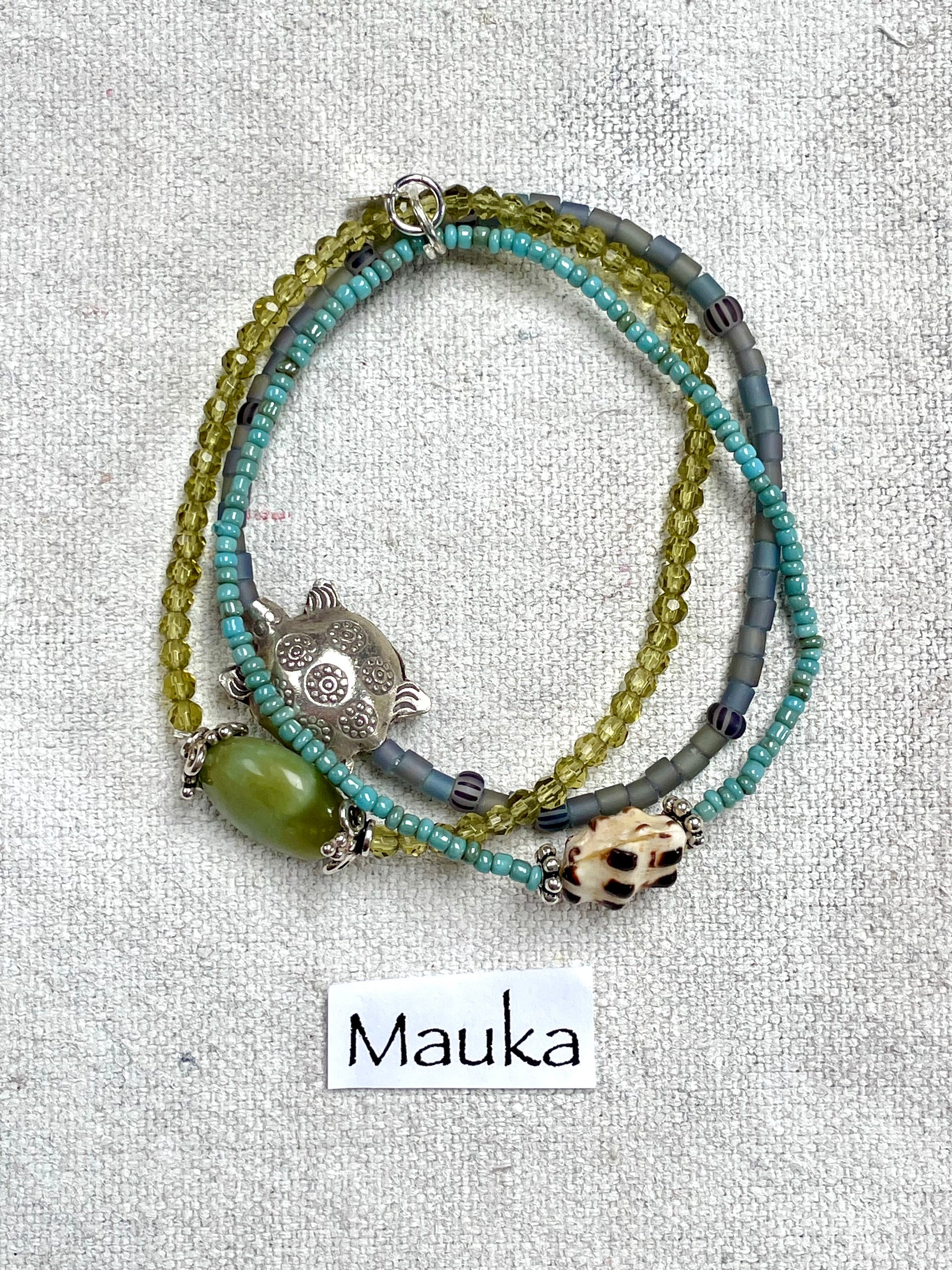 The Mauka bracelet brings a touch of Hawaiʻi to your everyday look. Handcrafted on Maui by Beth Ciaburri, this one-of-a-kind bracelet combines blue and green beads with a silver sea turtle charm and a shell to create a delicate yet bold design. Mauka is a Hawaiian word that means "toward the mountains" or "inland". Prices include US shipping.