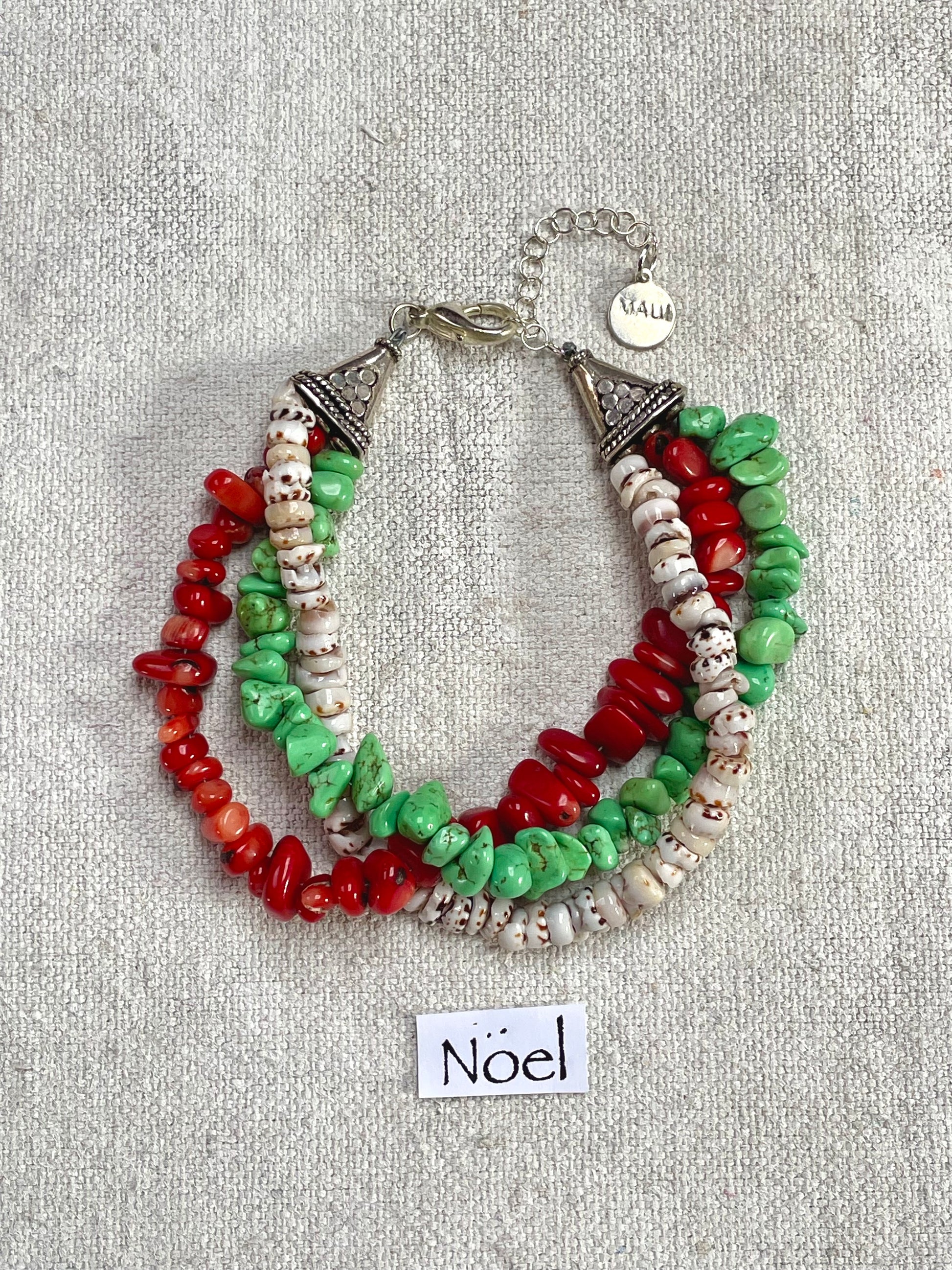 Perfect for the holidays or any other time of year, the Noel bracelet combines green and red semi-precious stones with white puka shells for a festive multi-strand bracelet. Handcrafted by Beth Ciaburri on Maui, the bracelet also includes an engraved Maui charm. Adjustable sizing. Prices include US Shipping.