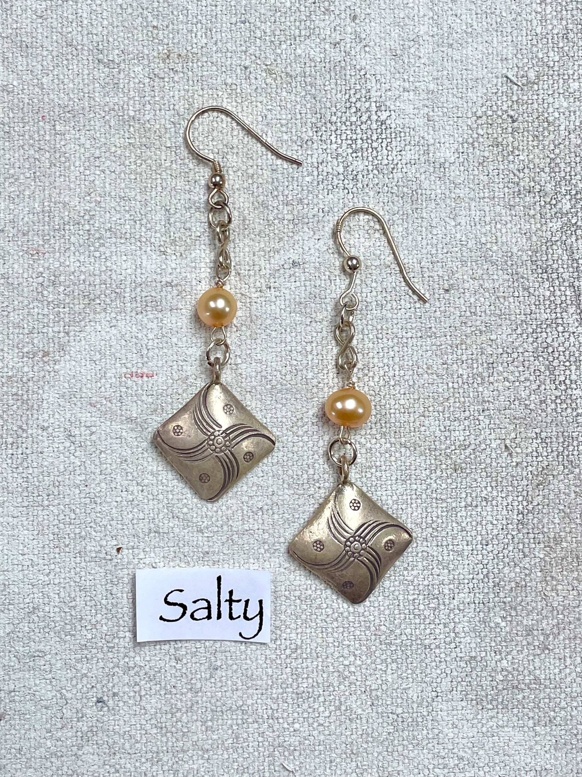 The Salty Earrings celebrate the artistry of Maui with a thoughtful blend of silver and faux pearl. Silver design pendants that are 2 parts classic and 1 part rustic will give you a modern boho look. Designed by Beth Ciaburri, these one-of-a-kind earrings are lightweight, comfortable, and a timeless accessory for night out or a day at the beach. Prices include US shipping.