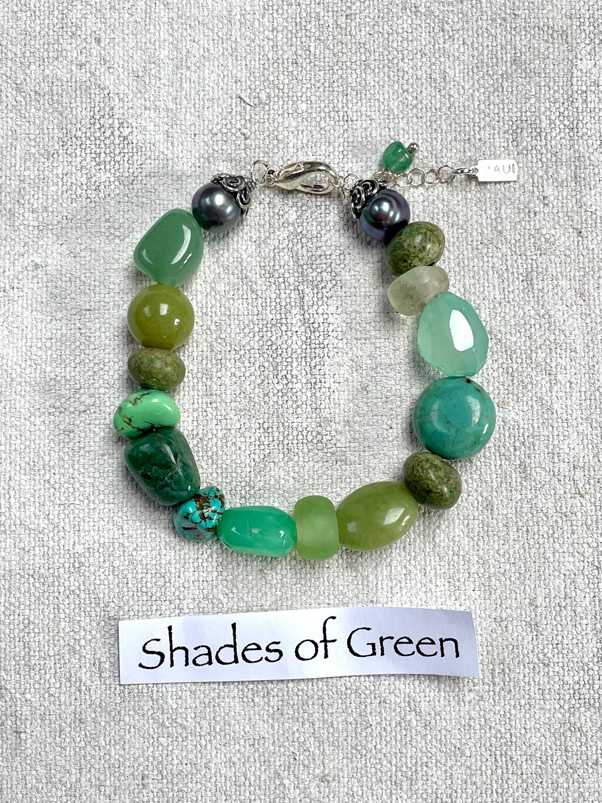 Shades of Green | Handmade Green Semi-Precious Stone, Black Pearl & Silver Bracelet
