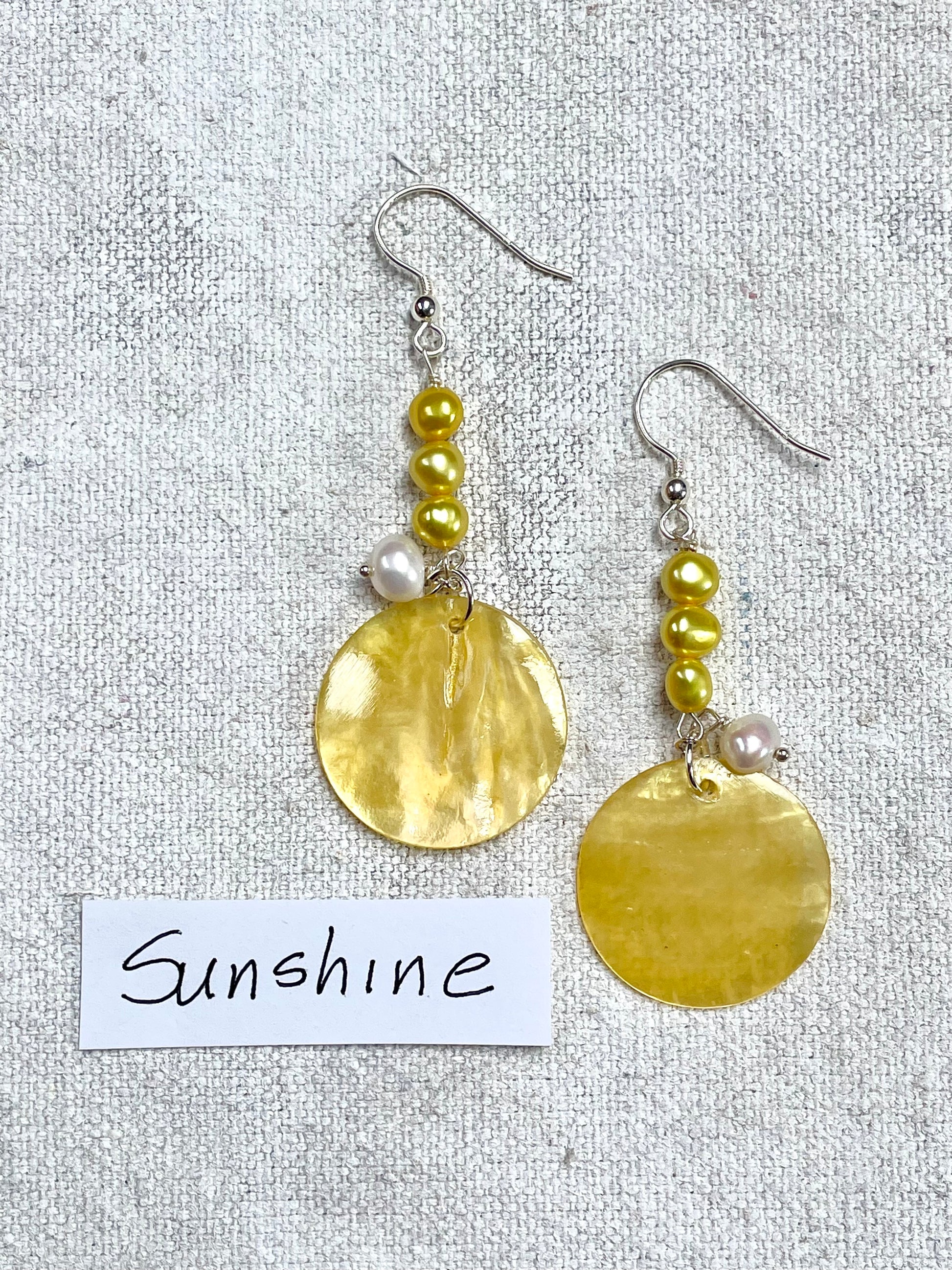 Add a pop of island-inspired bright yellow to your wardrobe with the Sunshine Earrings. Crafted on Maui by Beth Ciaburri, these earrings feature yellow pearlized shell and faux pearls on silver drop earrings, capturing the happy glow of the Hawaiian sunshine. Each pair is unique, just like the wearer. Prices include US shipping.