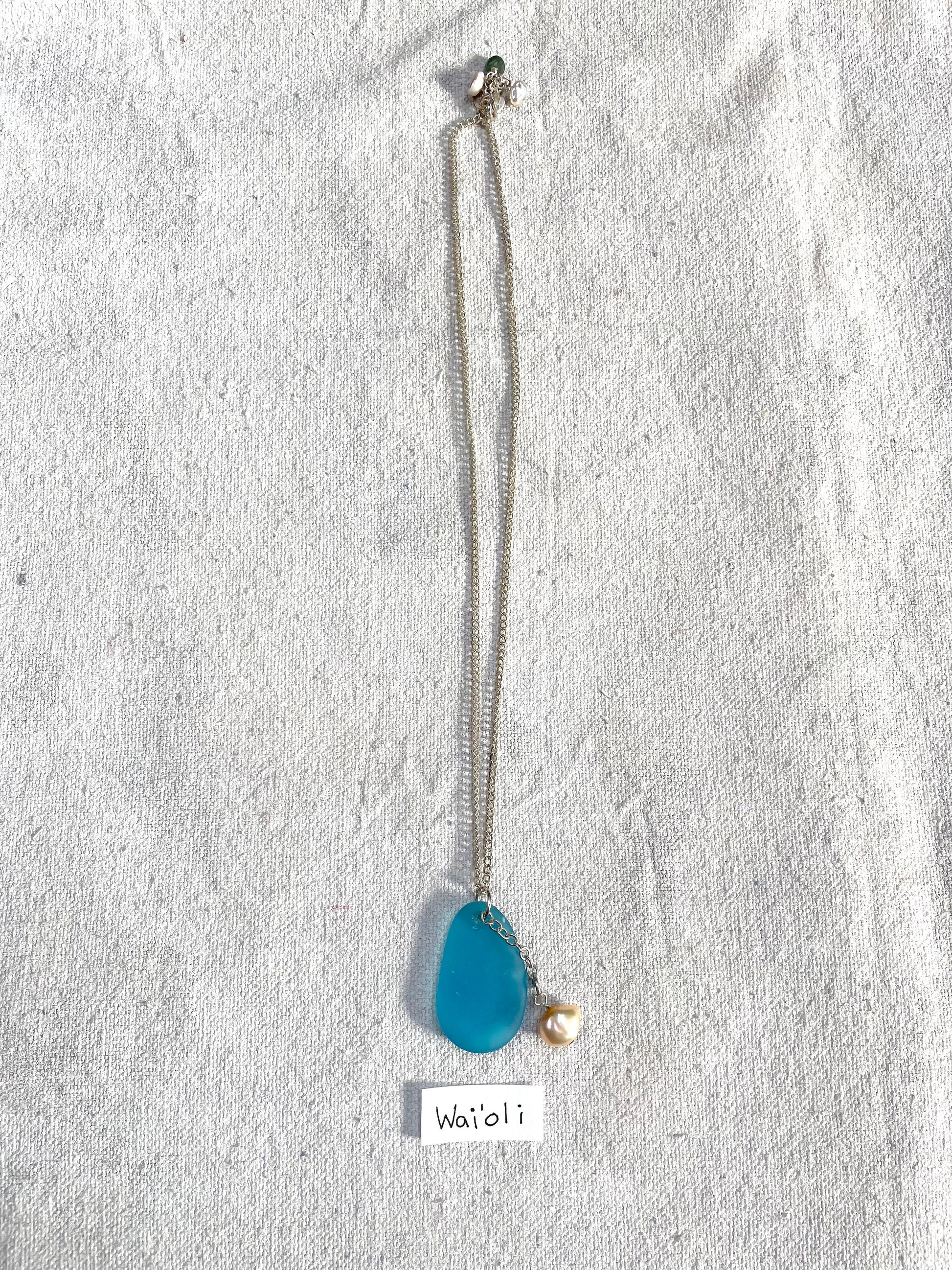 Wai ʻoli | Handmade on Maui Blue Sea Glass and Pearl Silver Necklace